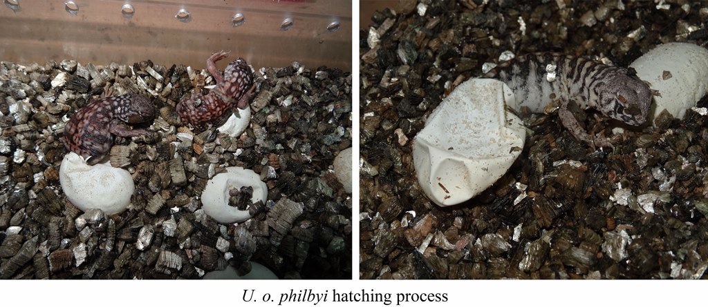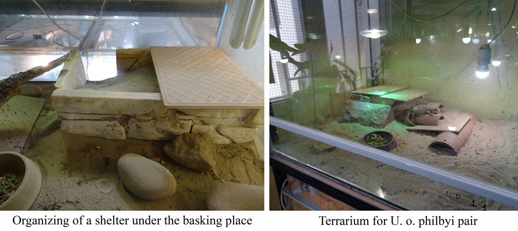Keeping. We keep adult U. o. philbyi in horizontal terrariums that should be long enough to provide temperature gradient. We use terrariums of 90*60*60 cm (35 *23*23 in) for a pair (1.1). We provide a layer of coarse sand or pressed loam as a substrate. Decoration includes bamboo steams, stones and artificial shelters (a ceramic plate on stones/2 bamboo trunks) along the terrarium’s perimeter and especially under the basking point. We keep them in pairs since animals of the same sex demonstrate aggression towards each other. On the opposite side from the basking place we make a hill of coarse sand that is lightly moistened during breeding season.